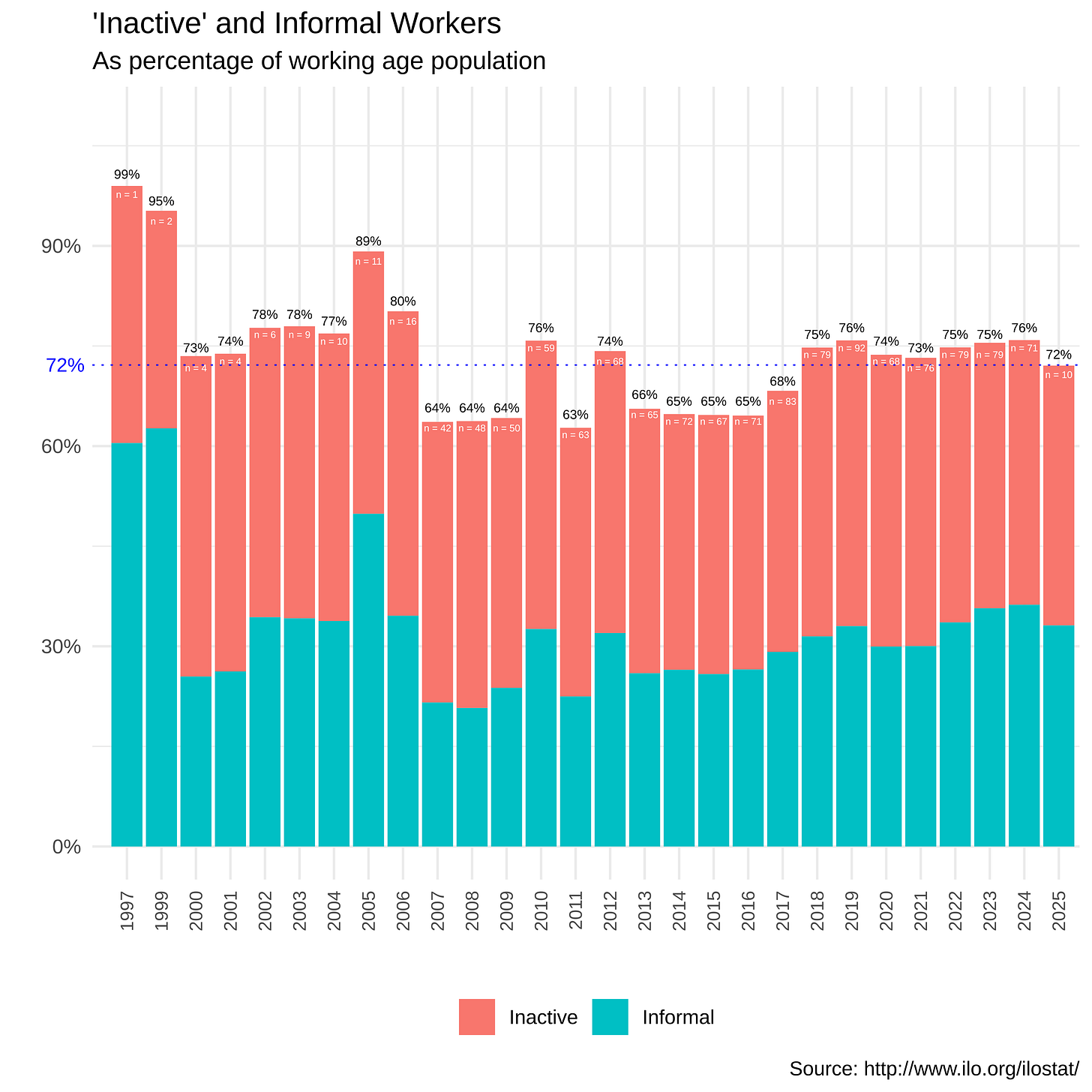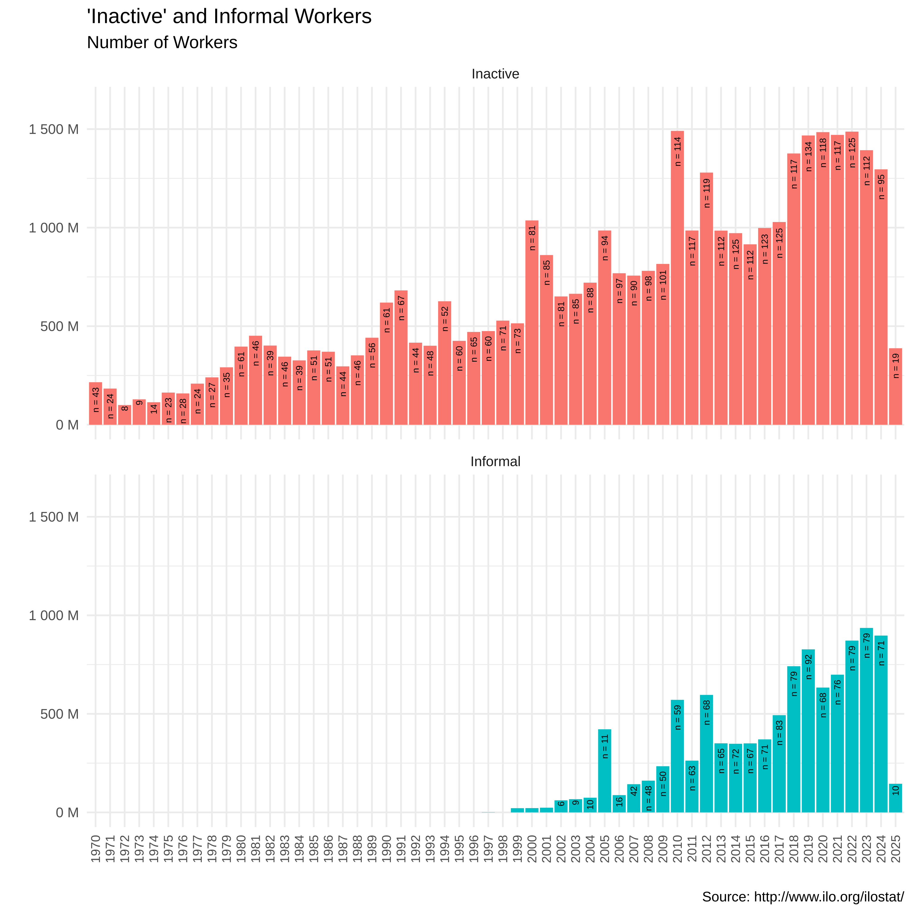 These are the numbers of inactive and informal workers for each year worldwide. And these numbers depend on the number of countries - noted in the bars - which reported these figures. So for example, “n = 10” means 10 countries reported the figures. And we can see that the number of countries reporting figures for informal workers is less than those reporting inactive workers. Not only that, from 1970 to 1996, there is no reporting of informal workers.